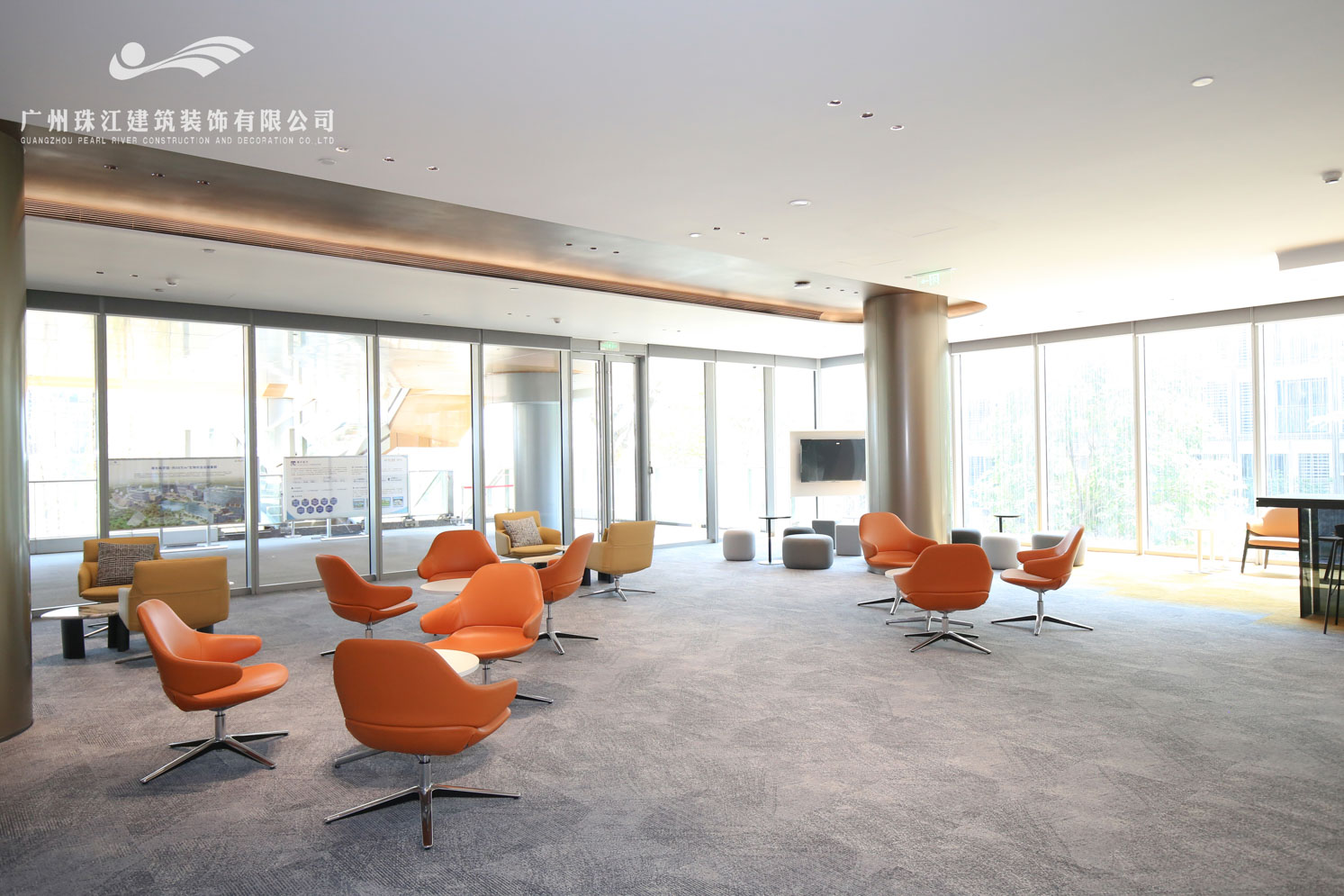 海大科学园的建筑外观采用现代简约的设计风格,以玻璃幕墙为主,搭配金属框架,展现出通透、轻盈的视觉效果。建筑线条流畅,园内设置了多个功能区域,咨询台、休息区、会议室、展示区以及洽谈区等主要重点区域。